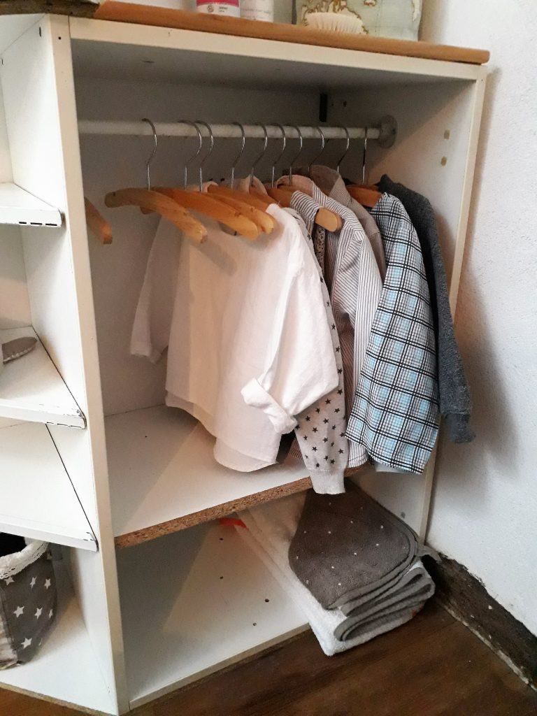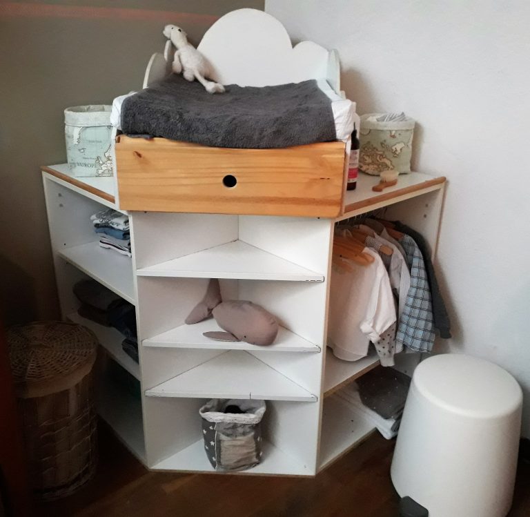 Le papa a fabriqué un super table à langer/garde-robe qui nous a simplifié la vie : en cas d’oubli de body, nous pouvons nous pencher sans lâcher bébé.