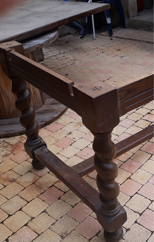 J’ai opté pour une vieille table aux pieds en bois tourné récupérée chez une tante. J’ai trouvé de la peinture blanche pour boiseries intérieures dans notre atelier et du vernis incolore.