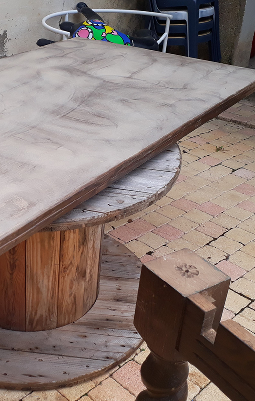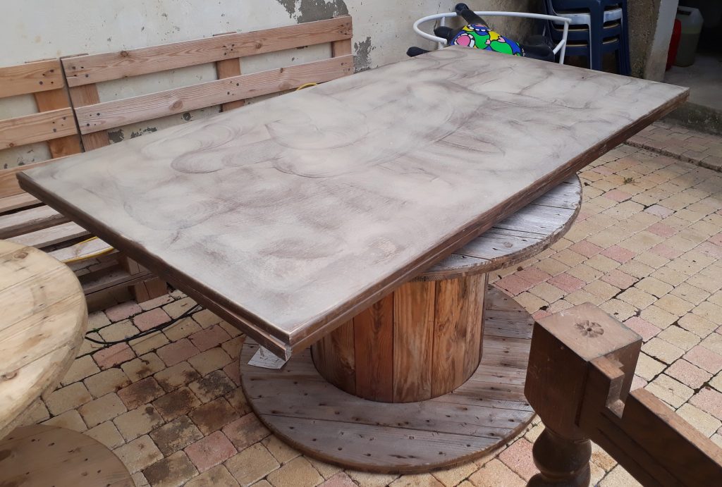 En pratique un coup de ponceuse, deux couches de peinture. J’ai choisi de passer seulement une couche sur le plateau pour créer un contraste avec les pieds.